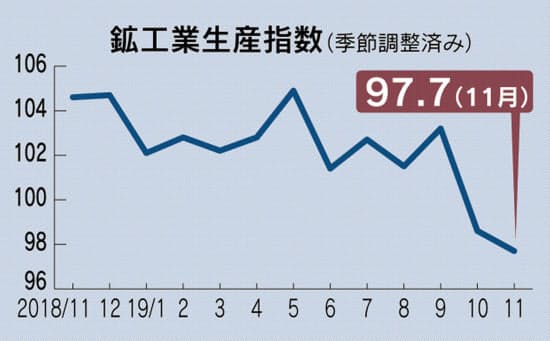 11月の鉱工業生産指数は前月比0.9%低下の97.7となり、2013年4月以来の低い水準だった。事前の市場予測の中央値よりも低下幅は小さかったが、10月の4.5%低下に続き、2カ月連続で前月を下回った。11月は10月の台風19号の影響がほぼ解消されるなかで、減産が続いた。国内外の需要の弱さを示しているといえる。